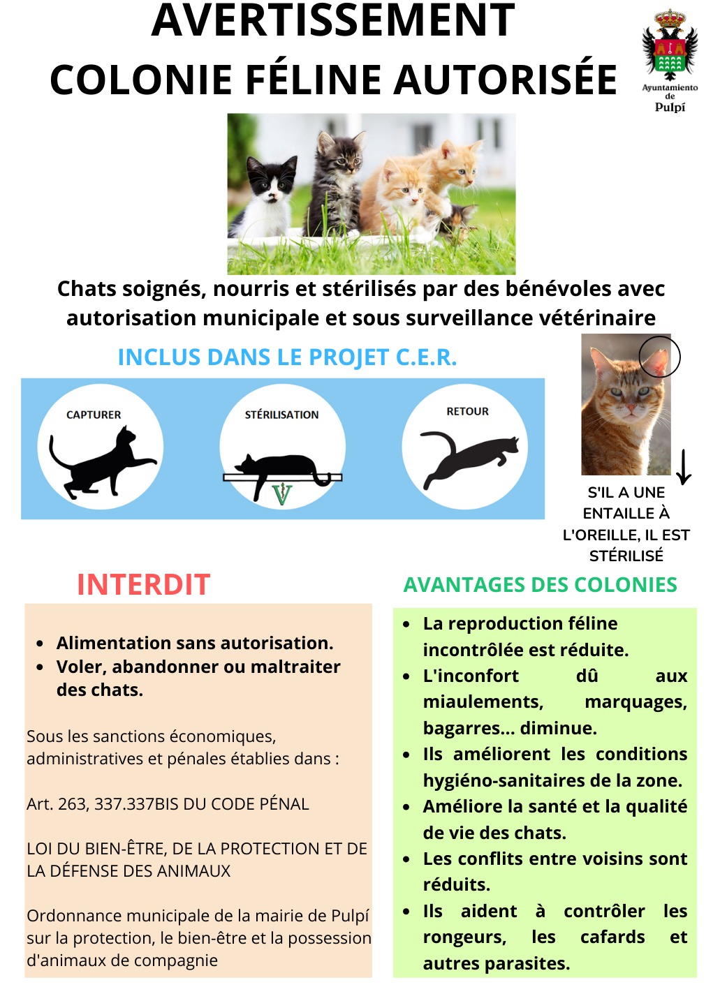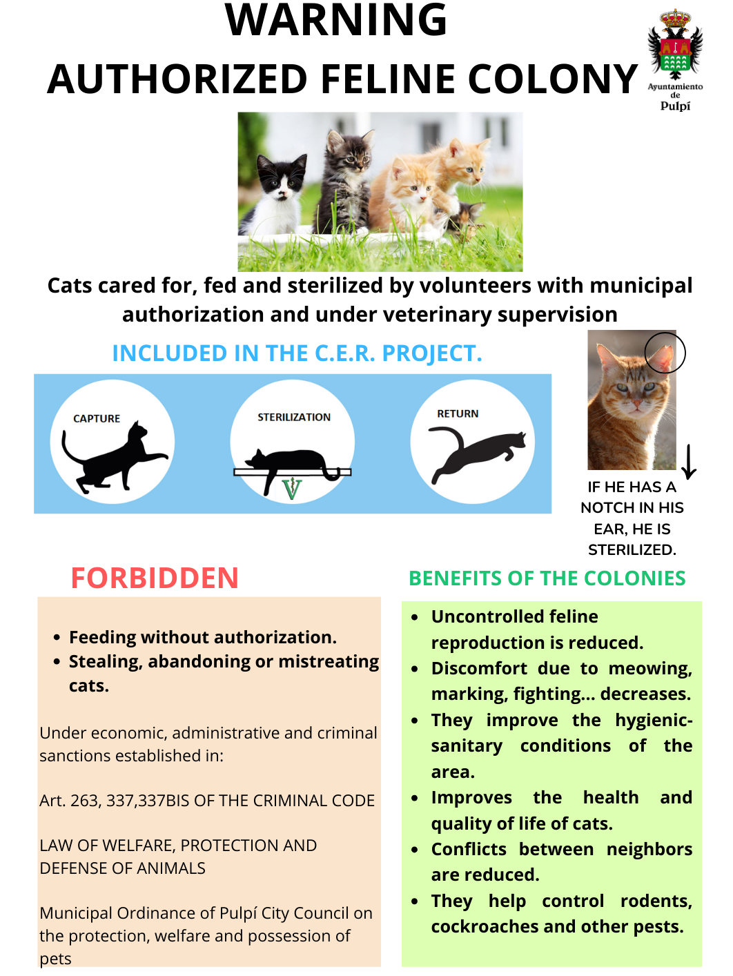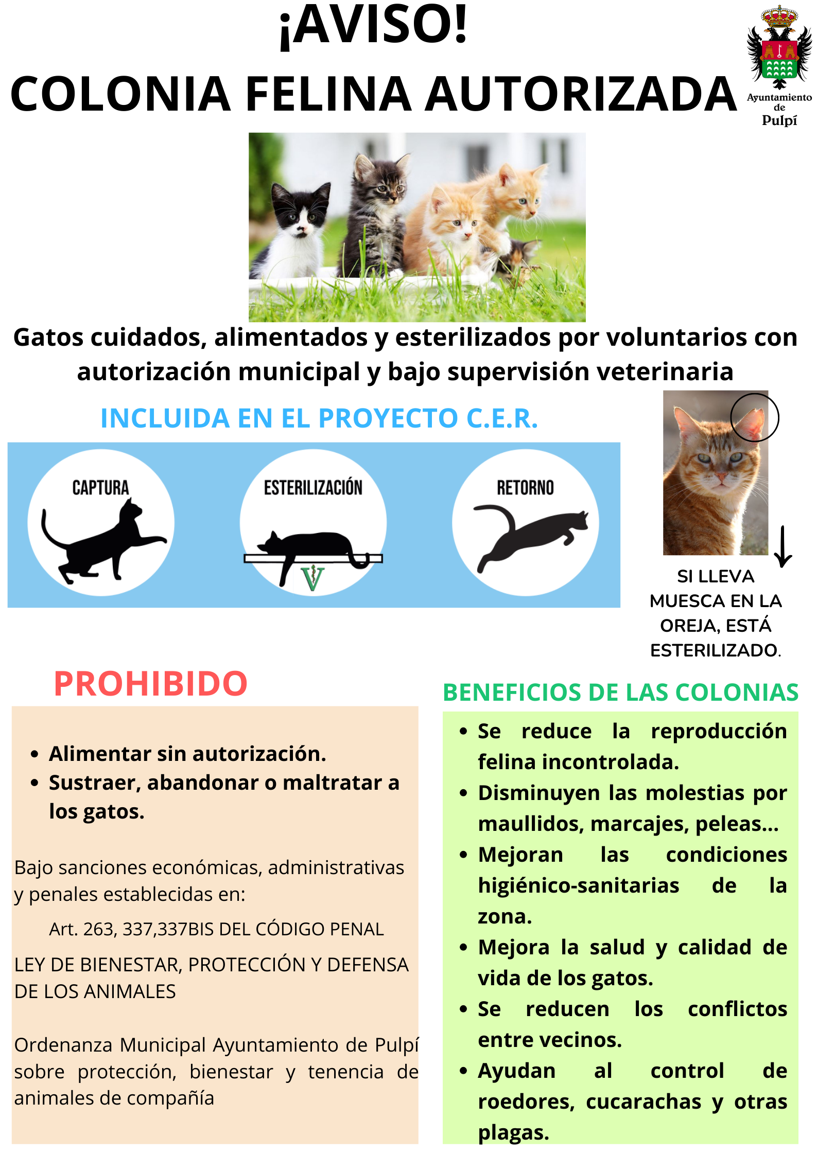 El proyecto CER (Captura - Esterilización - Retorno), financiado por el Ayuntamiento de Pulpí, es una solución al control poblacional de gatos callejeros y ferales, el cual consiste en el seguimiento y supervisión de estos gatos que habitan en las calles de nuestra ciudad. Para ello, se creó un registro de colonias, el cual, se actualiza continuamente.